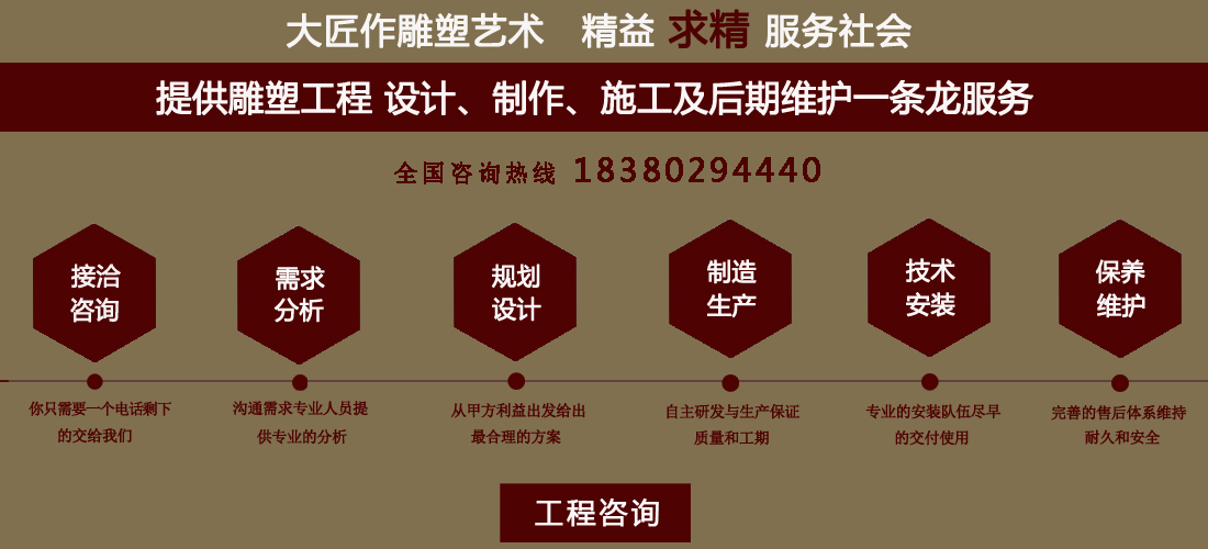 成都大匠作雕塑有限公司,是經(jīng)成都工商局審定注冊(cè)的正規(guī)專(zhuān)業(yè)雕塑制作及工程安裝服務(wù)機(jī)構(gòu),是由一群年輕富有朝氣的年輕人創(chuàng)辦,發(fā)軔于四川省成都市龍泉驛區(qū)。它是一家******于創(chuàng)作、制作和銷(xiāo)售為一體的公司。大匠作擁有多年從事公共藝術(shù)的專(zhuān)業(yè)人員和雕塑制作人組成的核心團(tuán)隊(duì),為您提供專(zhuān)業(yè)、具創(chuàng)新的設(shè)計(jì)及制作服務(wù)。公司成立以來(lái),秉承“******服務(wù)、誠(chéng)信為本”的宗旨,以客戶需求為目標(biāo)導(dǎo)向,不斷學(xué)習(xí),進(jìn)取,優(yōu)化和提高服務(wù)質(zhì)量,公司向您******——“您的滿意***是我們的信譽(yù)”,我們將以飽滿的熱情和******的服務(wù)贏得您的贊譽(yù)和支持。 愛(ài)心,細(xì)心,耐心,責(zé)任心是我們的要求,盡心盡職,為您打造出創(chuàng)新、專(zhuān)業(yè)、******的設(shè)計(jì)方案,我們堅(jiān)信先做人、后做事,用心對(duì)待客戶,實(shí)行透明收費(fèi),人性化服務(wù),本著對(duì)客戶負(fù)責(zé),對(duì)客戶負(fù)責(zé),更是對(duì)自己發(fā)展負(fù)責(zé)的態(tài)度,爭(zhēng)取做到讓每位客戶滿意